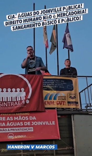 Na tarde de 23 de outubro, o ONDAS esteve presente, acompanhado Sintaema SC, em ato promovido na Praça da Bandeira de Joinville (SC) em defesa da Água de Joinville enquanto empresa pública municipal, ameaçada pelo avanço do capital privado por iniciativa da gestão do Partido Novo, que aportou na Câmara de Vereadores projetos de lei que atacam o caráter público da gestão dos serviços.