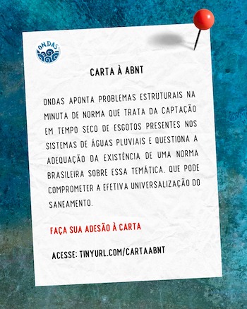 Continua aberta a possibilidade de adesão à carta divulgada pelo ONDAS que aponta problemas estruturais na minuta de norma que trata da captação em tempo seco de esgotos presentes nos sistemas de águas pluviais e questiona a adequação da existência de uma norma brasileira sobre essa temática, que pode comprometer a efetiva universalização do saneamento.
